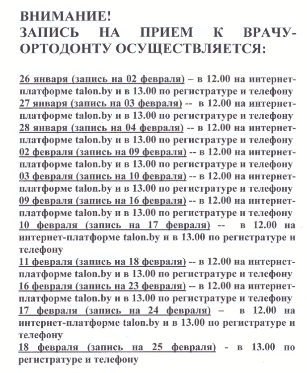 – запись на все виды планового приема к врачам – специалистам (терапевтического, хирургического, ортопедического профиля) в учреждении организована с максимальной потребностью через интернет – регистратуру «Talon.by», по многоканальным телефонам, и при непосредственном обращении в регистратуру поликлиники.